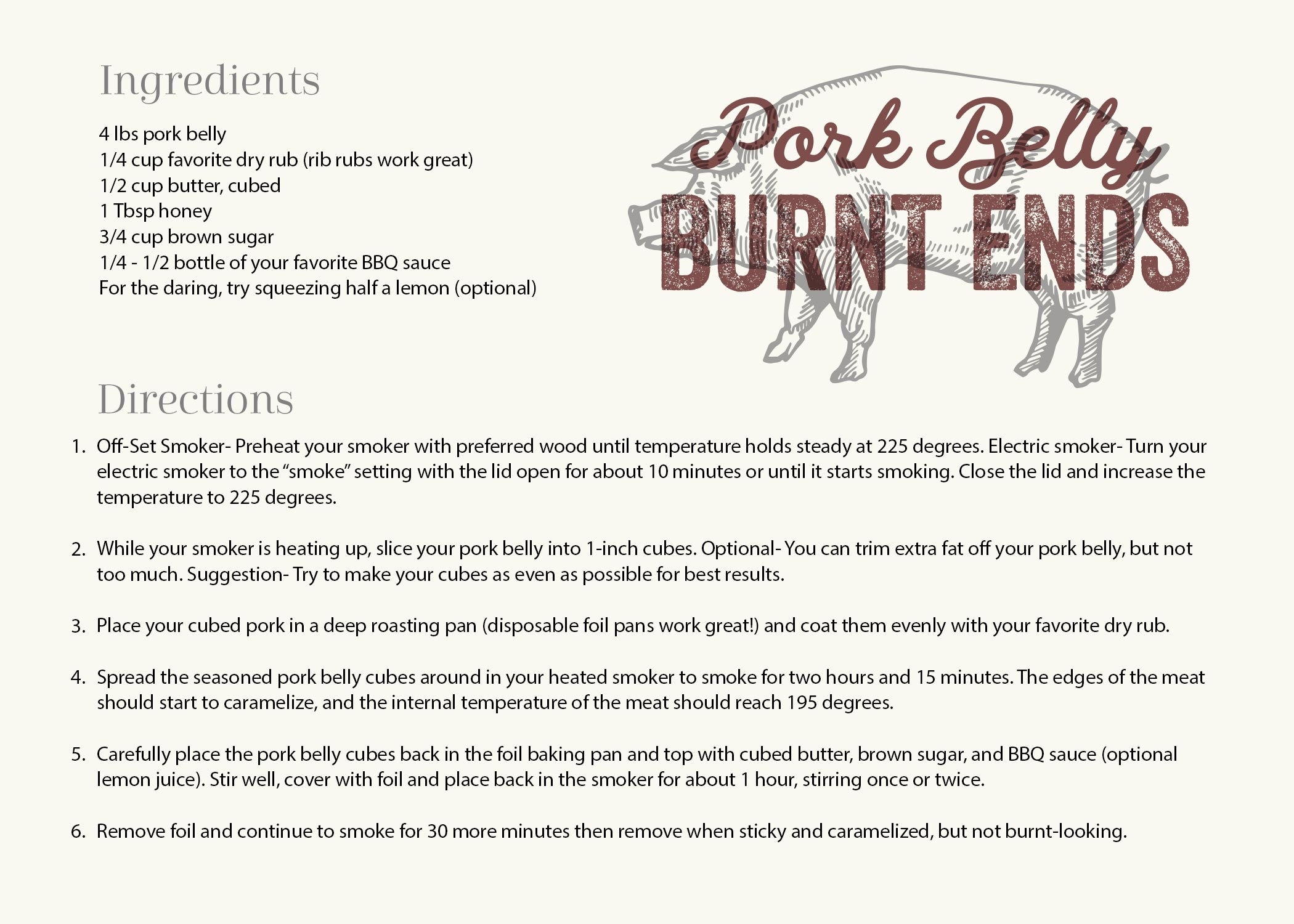 - Spread the seasoned pork belly cubes around in your heated smoker to smoke for two hours and 15 minutes. The edges of the meat should start to caramelize, and the internal temperature of the meat should reach 195 degrees.